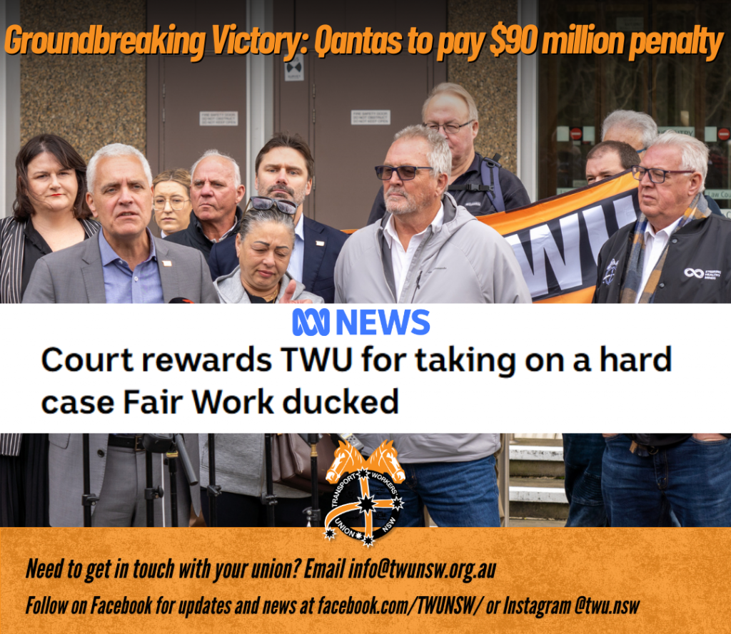 The TWU has welcomed last week’s Federal Court ruling that Qantas will be penalised $90 million – the largest employer penalty in Australian corporate history – for illegally sacking and outsourcing over 1800 workers, signalling the decision as a moment of justice for loyal workers who’d loved their jobs at the airline.
